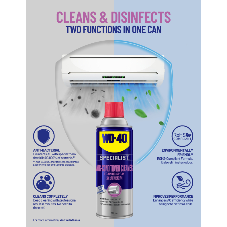 Disinfects AC with special foam that kills 99.999% of bacteria.**